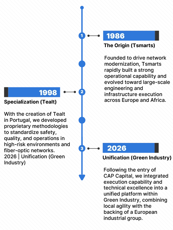 Tsmarts integrates the infrastructure division of Green Industry, CAP CAPITAL’s industrial vehicle. CAP is a European holding company that provides structure, corporate governance, and execution discipline. We act as an institutional guarantor, ensuring order and continuity to scale companies with strong potential.